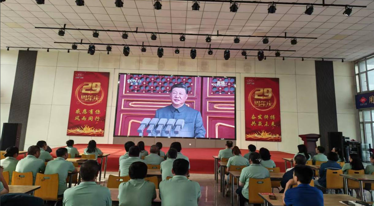 員工們?nèi)褙炞?,認真聆聽中共中央總書記、國家主席、中央軍委主席習(xí)近平的重要講話。“正義必勝、和平必勝、人民必勝”的鏗鏘宣言,讓大家感受到磅礴力量,民族自豪感和愛國之情油然而生。